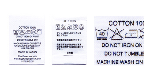 シーリング印刷より安価で品質表示・サイズネームが出来ます。生地はナイロン生地に両面コートしたニックセブンと、ポリエステルサテン地のネオサテンから選べます。