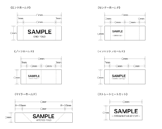 ネームタグの加工方法は大きく分けて、エンドホールド・センターホールド・ブックホールド・マンハッタンホールド・マイターホールド・ストレートヒートカット・板巻きの7種類あります。それぞれのタイプを参考にして下さい。