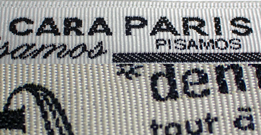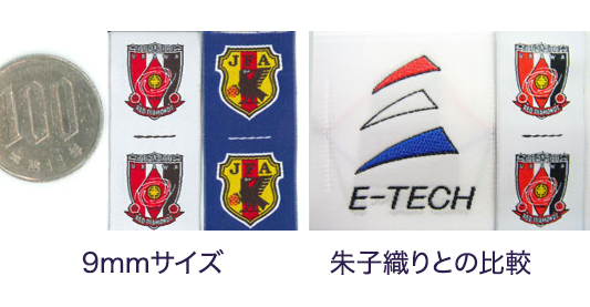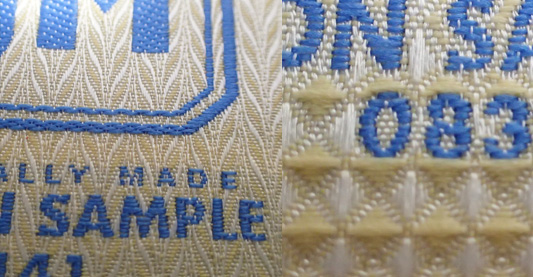 綿の織ネームは、全て平織となります。ベース用の横糸は、通常のレーヨンもしくは、綿糸から選べます。文字・柄用の横糸は、綿糸の場合は細かい柄には向きません。細かい場合は、綿に似たスパンポリエステル糸、通常のポリエステル糸から選べます。