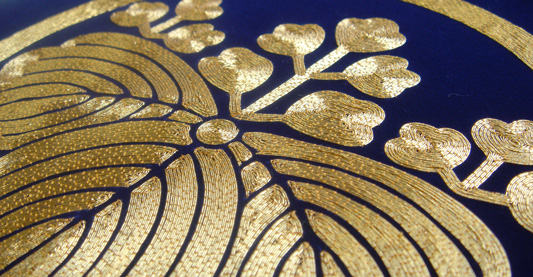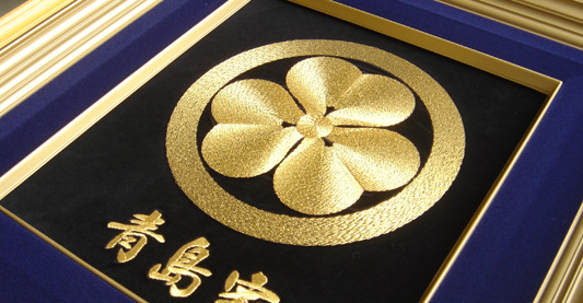 家紋額は代々に末永くお伝えいただくもの。重厚な刺繍家紋額に仕立てるこの刺繍は、新築祝いをはじめ、いろいろな記念品に喜ばれております。