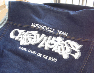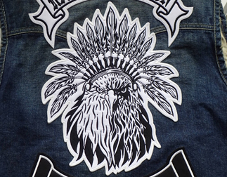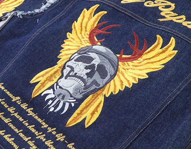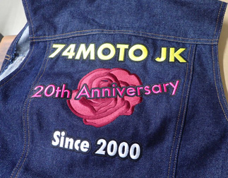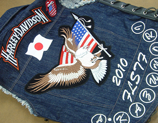 デニムベスト・ジャケットへの加工は、可能な場合は直接刺繍、機能素材についてはレザーベスト・ジャケットへの加工同様にワッペン(MCパッチ)を作成してから縫い付ける場合がございます。