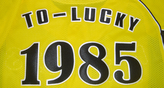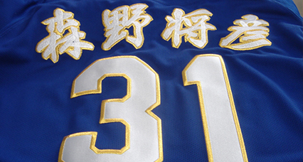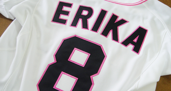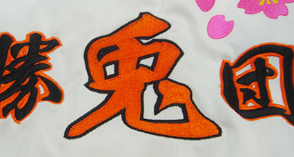 全て刺繍で加工します。費用はかかりますが、迫力・高級感刺繍ならではです。基本的に2~6cm程度の細かい文字はサテン刺繍、8cm以上の大きい文字はベタ畳埋めになります。背番号など大きい文字(15cmより大きい)の場合、ユニフォームの縮みによる「ツレ」が発生してしまうため「マークに縁取りサテン刺繍」をおすすめいたします。